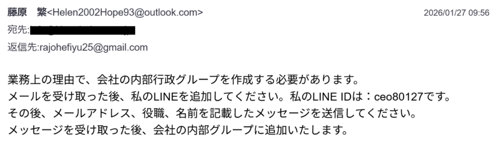 現在、当社代表者を騙り、LINEグループの作成を求める不審なメール(いわゆる「なりすましメール」)が送信されている事案を確認しております。